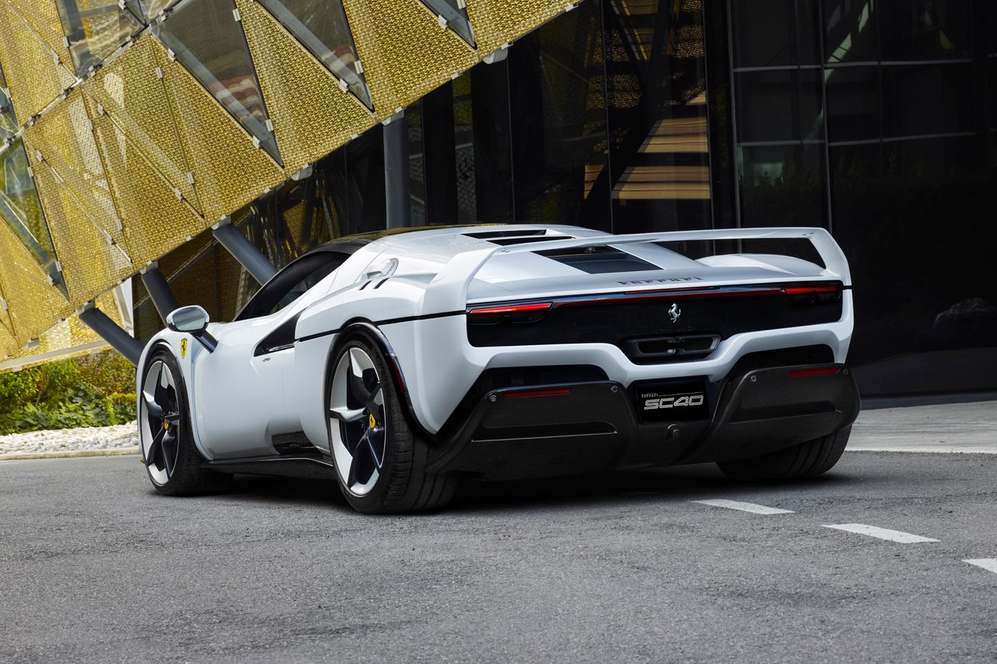 But the key to it all is at the front, where Ferrari has worked hard to mimic the F40’s distinctive headlight placement. It’s a shame the One-Off doesn’t get pop-ups, though the decision to integrate them into a black housing that spans the entire front bumper certainly gives the car a distinctive look— as does the special shade of white paint developed specially for the SC40. This sets off the lettering engraved on the side of the rear wing very nicely.